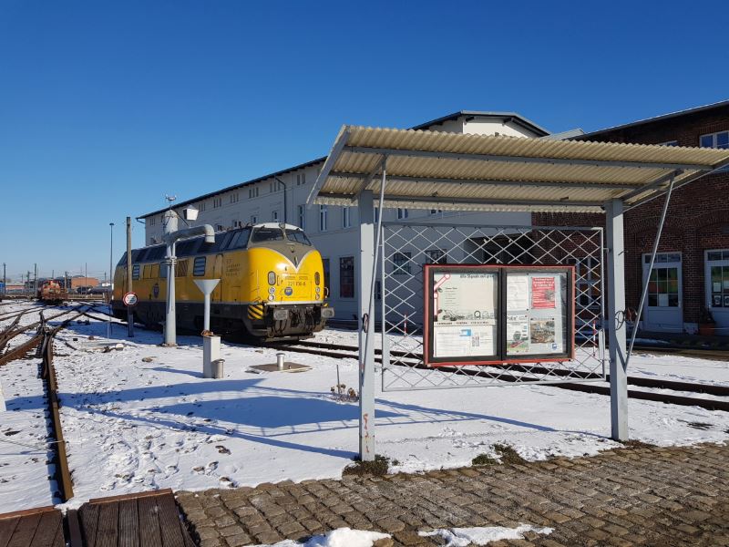 The 221 106 of the Potsdam railway company (EGP) is parked in front of the former dispatcher's building. The mighty diesel locomotive was mainly used for freight service in the Prignitz region in recent years and is now waiting for a workshop appointment.