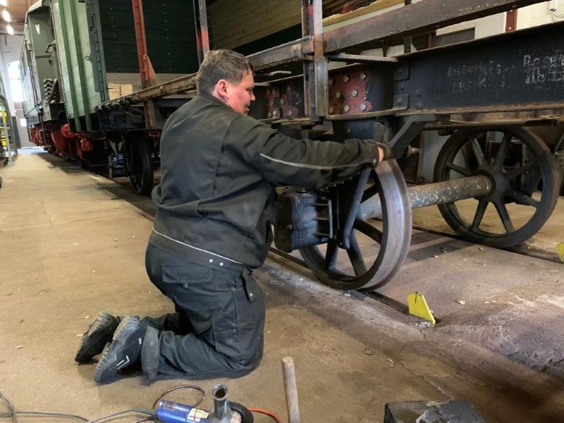 Der heutige Tag wurde der Fahrzeugpflege gewidmet. Gerade die Exponate, die derzeit draußen stehen müssen, brauchen regelmäßige Pflege. So wurden heute die Achslager unserer Dampflok 44 und der Dieselloks V60 und V22 abgeölt. Da die Exponate ziemlich schwer sind, haben wir die Diesellok 60022 in Betrieb genommen, mit der das Rangieren problemlos durchgeführt werden konnte. Bei der Diesellok handelt es sich um eine Maschine aus dem Hause MaK in Kiel mit 600 PS. Interessant an der Lok ist, dass sie nicht über einen elektrischen Starter zum Starten des Motors verfügt. Vielmehr wird Druckluft in den Motor eingespeist, so dass er die ersten Umdrehungen pneumatisch absolviert. Dabei wird Diesel in die Zylinder eingespritzt und der Motor nimmt Zündung auf. Wie das funktioniert, zeigt der folgende Film: