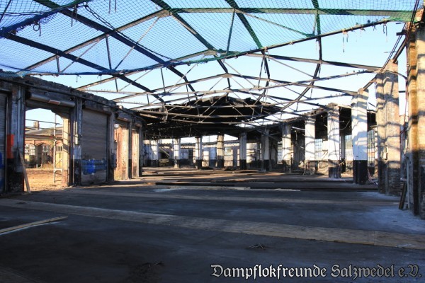 Inzwischen sind die Arbeiten am Lokschuppen Wittenberge weiter vorangeschritten. Fast der gesamte Dachbelag wurde entfernt, so dass es im Lokschuppen ungewöhnlich hell ist.