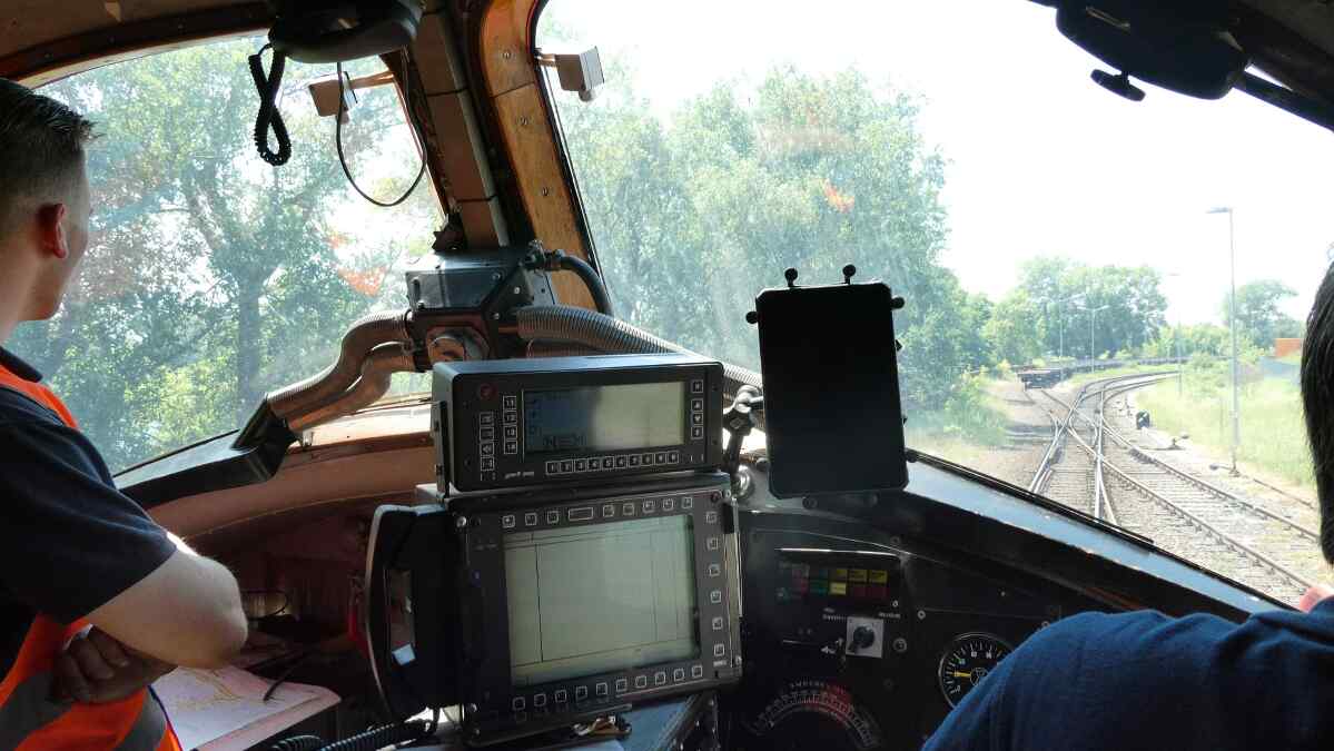 Here is another picture from the driver's cab window during a round trip on the Wittenbergen harbour railway. The engine driver is on the right, the pilot, who knows his way around the harbour, is on the left.