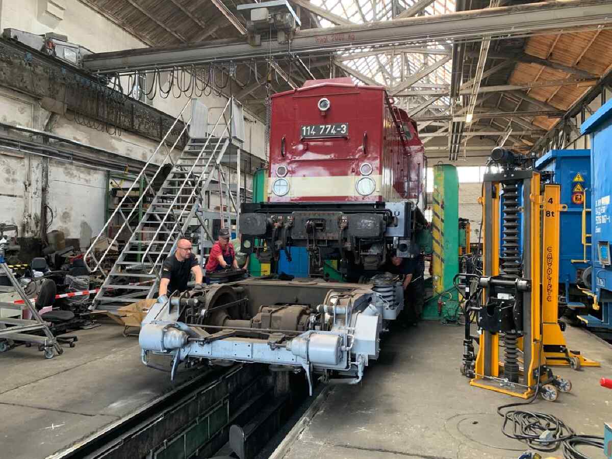 We have already reported several times on the refurbishment of our V100.1 diesel locomotive, which bears the number 114 774-3. After having already taken care of the locomotive's chassis and brakes some time ago, the engine has been the focus of attention in recent weeks. For technology enthusiasts, it is worth mentioning that the engine was manufactured by VEB Kühlautomat Berlin-Johannistal. With its 12 cylinders and turbocharger, it generates an output of just under 1,500 hp. This makes it the most powerful engine variant ever installed in locomotives of this type.