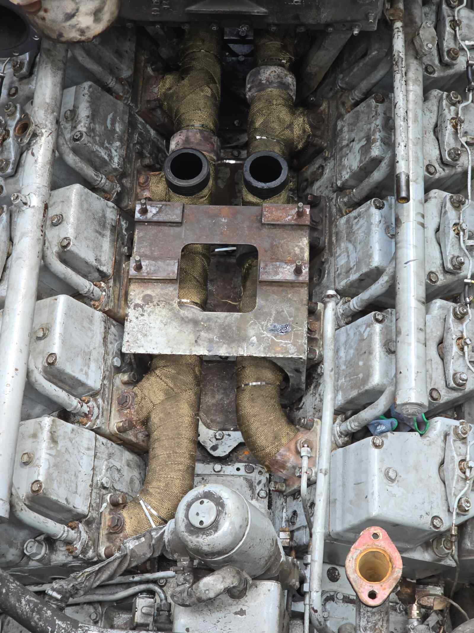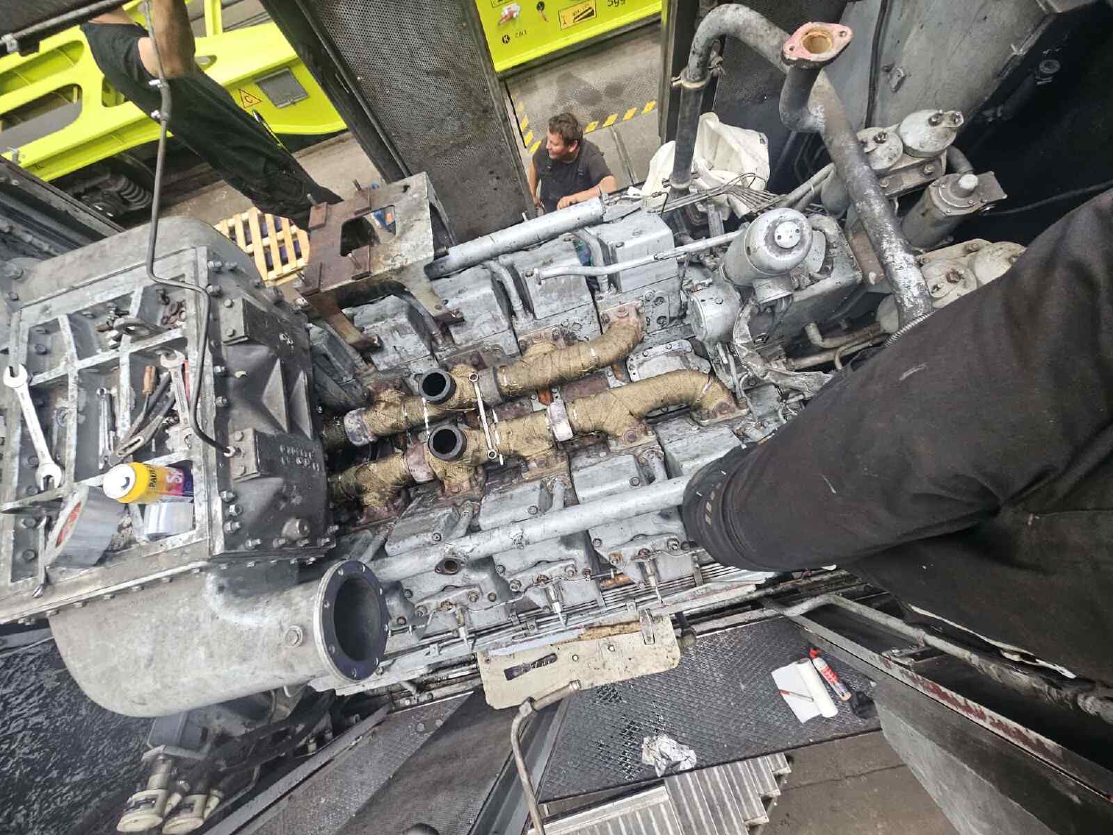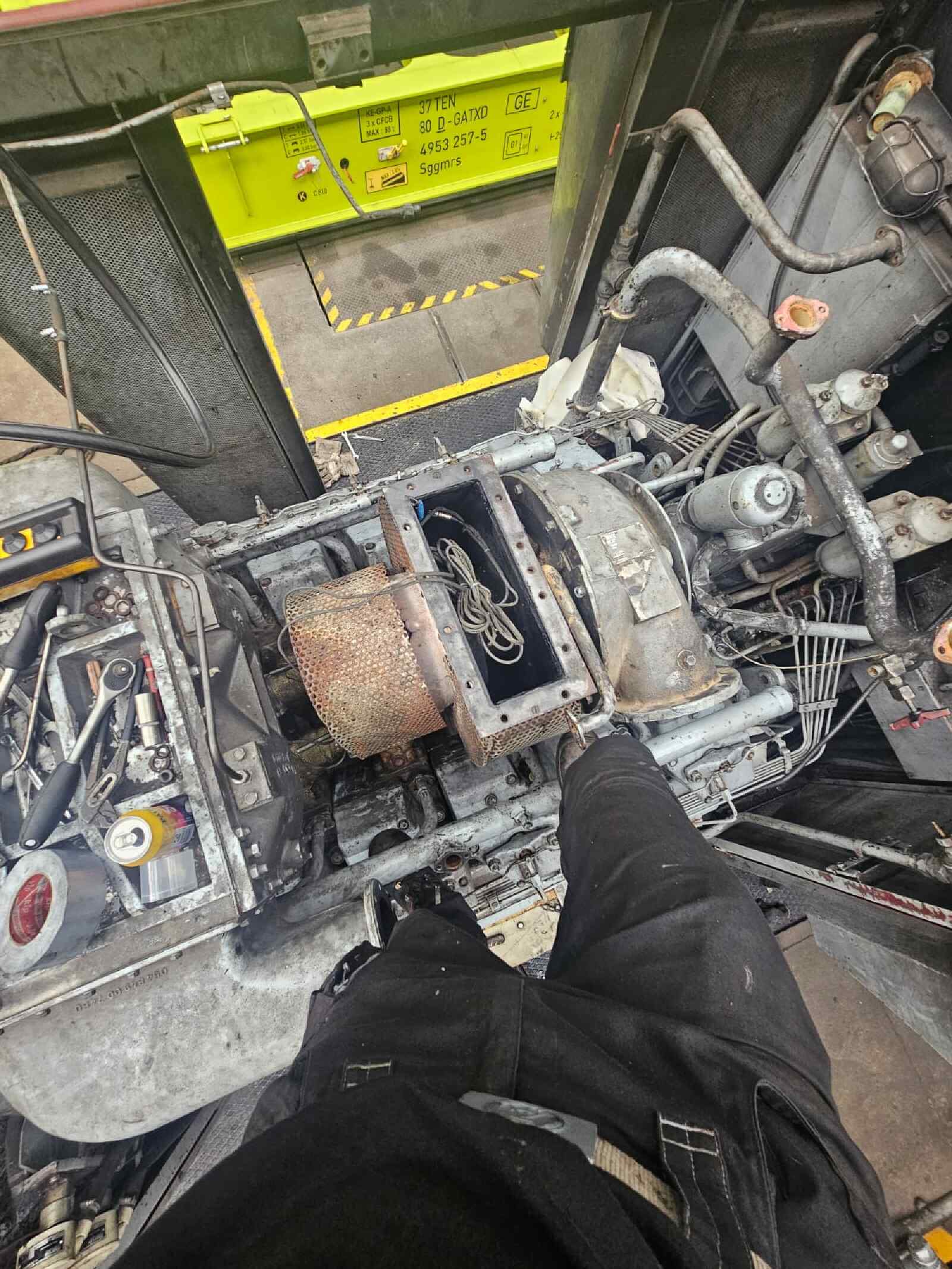Although our engine had only run for a few dozen operating hours since its last major overhaul a few years ago, leaks had developed in the turbocharger during the long period of inactivity since the locomotive was taken out of service by its last commercial owner. These leaks had to be repaired before we can put the locomotive back into service. To do this, the turbocharger and various other attachments were removed from the engine compartment so that they could be reconditioned.