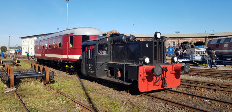 One of the two operable class V23 diesel locomotives was taken to the workshop to be thoroughly cleaned. The locomotive has so far the number 2 of the Stendal pulp mill and a blue livery. It will soon be painted orange and bear the number 102 076. This is a reminder of the use of an identical locomotive with this number at the Wittenberge depot in the days of the Deutsche Reichsbahn. The locomotive is to be used in future together with the VB 197 805 sidecar, which will soon be operational again. This combination of such sidecars and locomotives used to be typical for the branch lines in the Prignitz and the neighbouring Altmark.