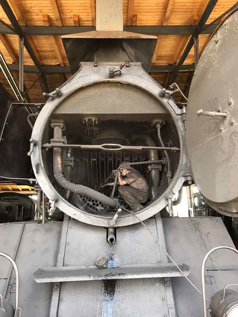 Am heutigen Samstag war das Museum letztmalig regulär in diesem Jahr geöffnet. Diese Gelegenheit nutzten etliche Besucher, um uns noch einen Besuch abzustatten. Vielen Dank für Ihr Kommen in diesem Jahr. Die Aktiven waren damit beschäftigt, einige Lokomotiven auf den Winter vorzubereiten. So wurden alle Dampfloks ausgeschlackt und ihre Feuerkisten und Rauchkammern gründlich gereinigt. Bei der Dampflok Emma wurde zudem der Kessel ausgewaschen, weil sich während des Betriebs Kalkrückstände an seiner Innenseite ablagern. Sie kennen das vielleicht von ihrem Wasserkessel oder dem Heizstab ihrer Waschmaschine daheim. Der Kalk muss von Zeit zu Zeit entfernt werden. Dazu werden alle Waschluken im Kessel geöffnet und der Kessel mit einem scharfen Wasserstrahl ausgewaschen. Das folgende Bild zeigt den Kollegen beim Öffnen einer Luke auf der Oberseite des Kessels