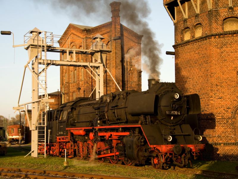 The Bahnbetriebswerk (Bw), or railway motive power depot Wittenberge, looks back over more than 160 years of history. Once, Bw Wittenberge was one of the largest on the German State Railway (DR). As long ago as 1846, the Berlin-Hamburg Railway (BHE) started using the first loco-shed, today known as No. 3 shed. In 1872, there followed a roundhouse with 18 tracks and a turntable at its centre (later known as No. 1 shed). Between these two sheds, a roundhouse shed was built in 1889, the "historic engine shed" of today. Two water towers were added in 1873 and 1898, with various workshops and locomotive servicing facilities expanding the motive power depot which in 1915 reached the size we see today.