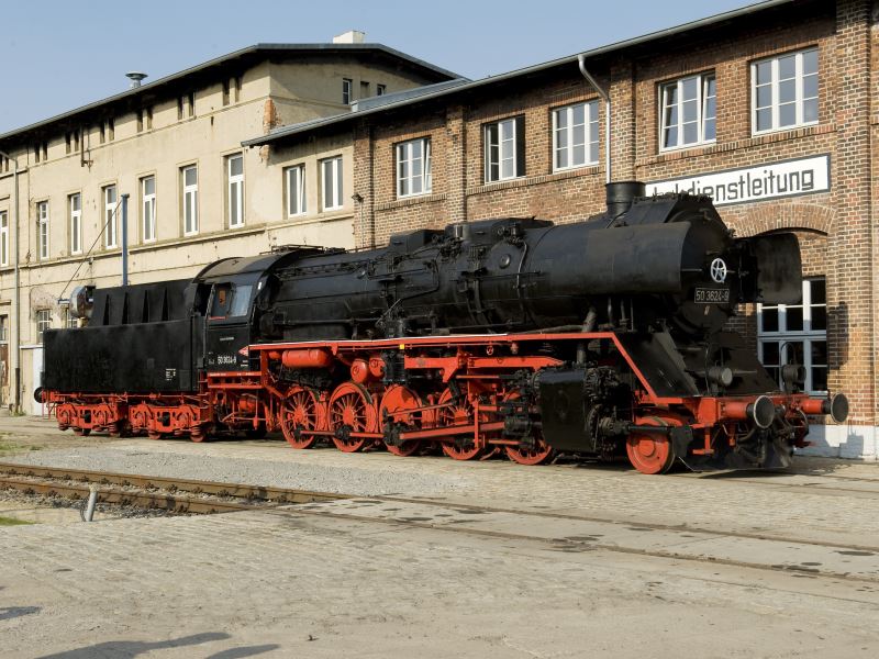 Undoubtedly, the stars of the collection are the four steam locos of class 50.35, for such a long time typical of Wittenberge depot. Apart from these, visitors can also admire the cute little industrial loco Emma and a class 44 heavy freight loco, as well as seven main-line diesels and seven smaller diesel locos The railway enthusiasts also look after a hospital carriage of the Deutsche Reichsbahn, the car-carrier which formed part of the first GDR ministerial train and a number of hand-trolleys. The signal box "Wm", built in 1909, is also part of the railway museum and anyone who wishes to try their hand on the levers can find out just how much physical effort lay behind resetting points and signals in the old days.