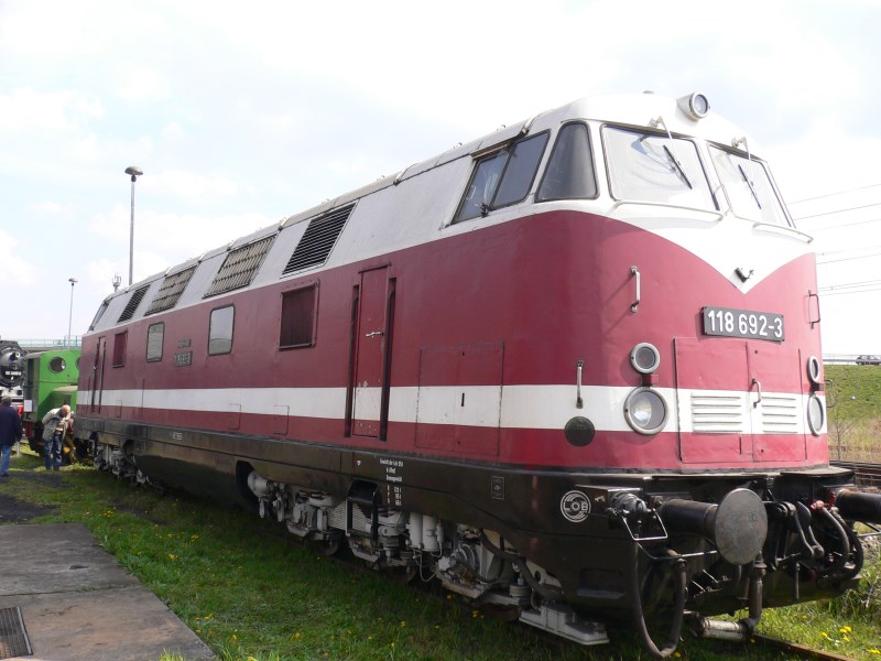 Die Diesellok 118 692-3 haben wir in unsere Sammlung aufgenommen, weil sie zu einer der typischen Bauarten gehört, die die Dampfloks in der Altmark zu Beginn der achtziger Jahre abgelöst haben. Inzwischen gehört auch sie schon zum alten Eisen und so ging es im Jahr 1997 nur um Tage, um sie vor der Verschrottung zu bewahren. Nachdem die Deutsche Bahn AG sich bereiterklärt hatte, uns diese Lok als Dauerleihgabe zur Verfügung zu stellen, haben wir sie von einem Abstellplatz in Wittenberg geborgen und inzwischen in Salzwedel äußerlich aufgearbeitet.