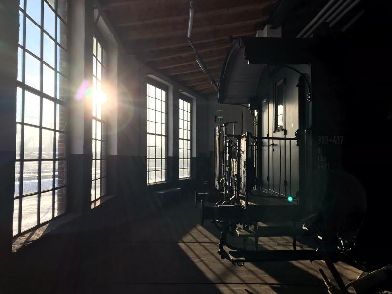 In the first picture the sun is shining through the rear windows of the locomotive shed and touches the passenger coach, which is used from time to time for round trips in the area.
