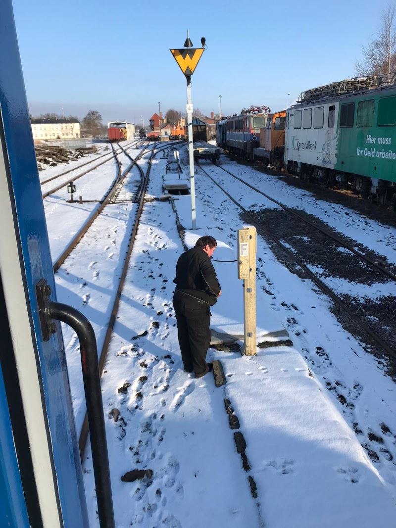 As all points in the shunting district on the Magdeburg side are operated by signal box Wm, the shunter has to communicate with the signalman via telephone.