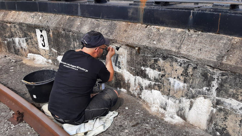 A colleague preferred to enjoy the nice weather outside the locomotive shed. He took pity on the track markings that had been placed in the turntable pit. These had become somewhat weathered over the last few years. The turntable operator can orientate himself by these markings.