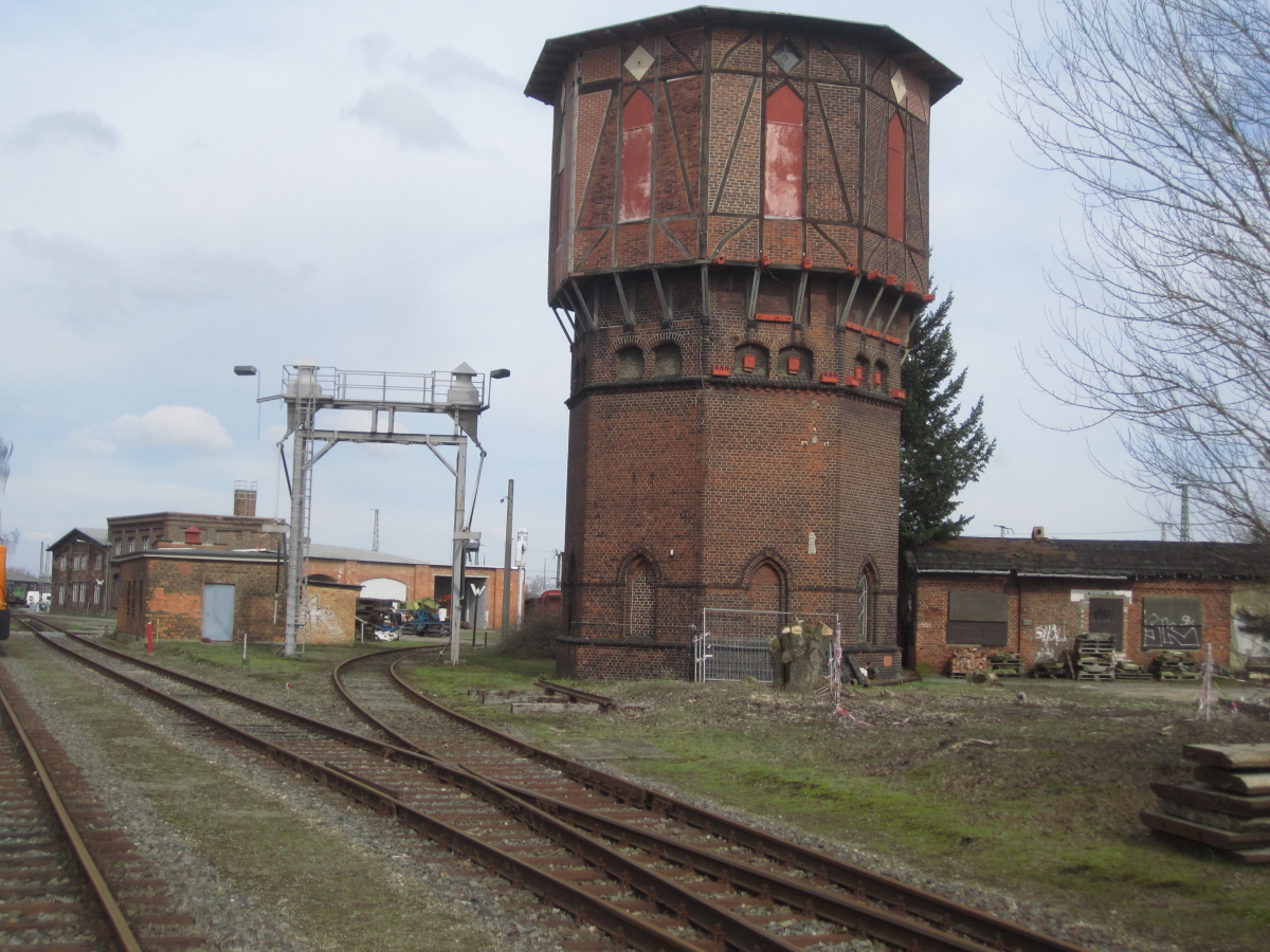 Vor einigen Wochen haben wir für Sie, liebe Leser, bereits einen Blick in unseren Wasserturm geworfen. Dort haben Sie den großen Vorratsbehälter gesehen, in dem das Wasser für unsere Dampflokomotiven aufbewahrt wird. Heute wollen wir Ihnen zeigen, woher dieses Wasser kommt. Dafür haben wir zwei "Quellen", die noch aus den Anfangszeiten des Bahnbetriebswerkes im späten 19. Jahrhundert stammen. Einerseits gibt es einen unterirdischen Zufluss von dem Flüsschen Stepenitz, das hinter den Bahngleisen auf der Berliner Seite verläuft. Ein unterirdischer Kanal führt von diesem Fluss bis auf das Lokschuppengelände. Er endet in der Nähe des Wasserturms in einem tiefen Schacht. Hier sind elektrische Pumpen angebracht, die das Wasser in den Turm fördern. Auf dem folgenden Bild erkennen Sie den Verlauf des Kanals, angedeutet durch eine gestrichelte Linie (Bildquelle: Google Earth).